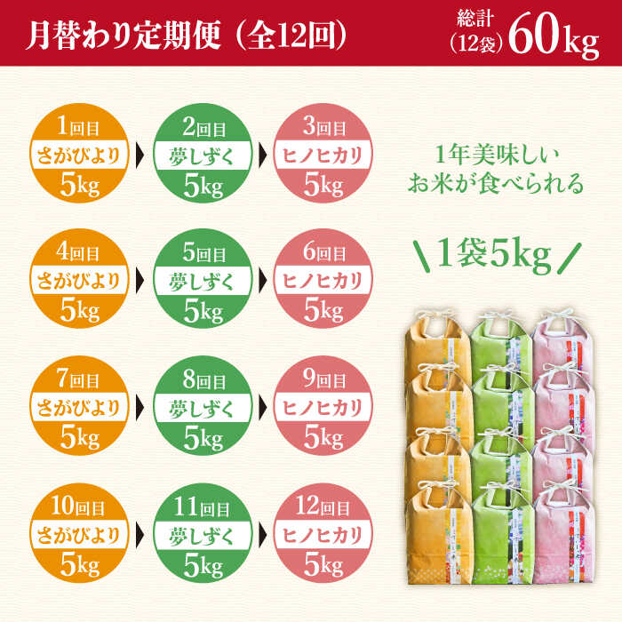 佐賀米の健康優良児として根強い人気を誇っています! 商品説明 名称全12回定期便 3銘柄米 月替わり定期便 総計60kg(さがびより・夢しずく・ヒノヒカリ) 一粒 内容量■全12回定期便■ 月毎に下記内容をお届けします。