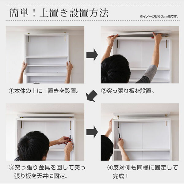 本体と合わせれば、本棚の上のデットスペースも有効活用! ■本体サイズ [外寸]幅90×奥行16×高さ57.5〜66.5cm ■その他サイズ [内寸] (オープン部)幅42×奥行14.5×高さ42〜51cm (可動棚)幅42×奥行14×厚み1.5cm(1cmピッチ31穴) ■材質 [本体]プリント紙化粧繊維板 ■収納量・耐荷重 【耐荷重】[棚板]約5kg以下 【収納量】[文庫本]約168冊[コミック]約112冊[DVD]約112枚[CD]約252枚[Blu-ray]約128枚 ■備考 ・可動棚:小4枚 ■生産国 中国 ■組立時間(目安)(大人2人) お客様組立(20分)現在ご覧のページは【幅90cm 上置き】です
