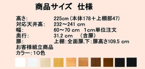 全面壁整理棚_ 全面壁ラック_ 全面扉オフィス書棚_ 全面扉オフィス書庫_価格 サイズ一覧 色 仕様 多サイズ 耐荷重 棚受 扉 取手 転倒防止 突張棚 天板 突張強化 追加加工 注文 オーダー 天井つっぱり壁面書庫 (シリーズ天井高208〜292cm、幅15〜90cm) 標準棚板(厚さ1.7cm) 棚板耐荷重:4Kg 奥行31cm 対応天井高さ232〜241cm 幅60〜70cm 下扉高109.5cm 低ホルムアルデヒド 上下扉タイプ 天井つっぱり壁面書庫 【幅ピッタリ】 幅60〜70cmを1cm単位でご指定頂けます。