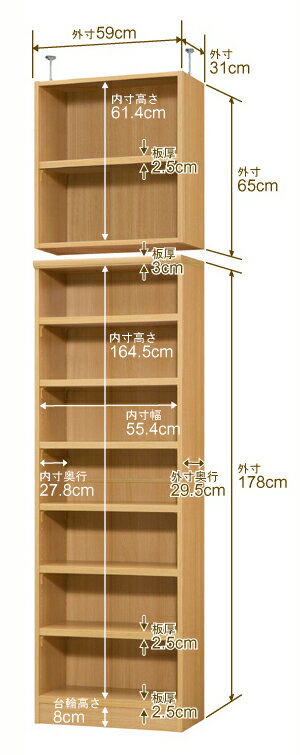 天井つっぱり上置棚サイズ奥行29.5cm×高さ65cm×幅59cm材 質本体・プリント紙化粧繊維板突っ張り金具・スチール塗 装ウレタン樹脂塗装本体:オーダーマルチラックサイズ奥行31cm×高さ178cm×幅59cm材 質プリント紙化粧繊維板塗 装ウレタン樹脂塗装棚 板棚 板耐荷重左の耐荷重基準値表を参照棚 板奥行27.8cm奥行31cm×高さ250〜259cm×幅59cm