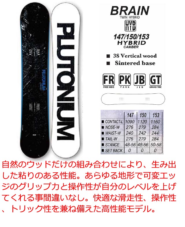 PLUTONIUM【BRAIN】 形状 ハイブリッドキャンバー(HYBRID CAMBER)ツインチップ 滑走適正スタイル 1.グラトリ 2.フリーラン 3.ジブトリック(BOX&レール) (スタイルや技術によって変化します) コメント 自然のウッドだけの組み合わせにより、生み出した粘りのある性能。