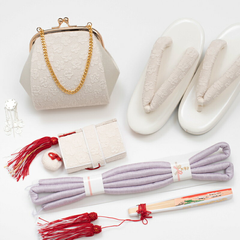 生地や柄にこだわったデザイン性のある小物が映えること間違いなし! 末広、はこせこ、丸ぐけ、ビラ簪、草履、バッグのセットです ★